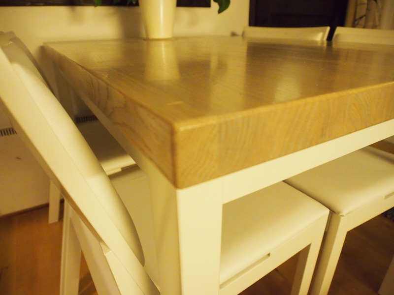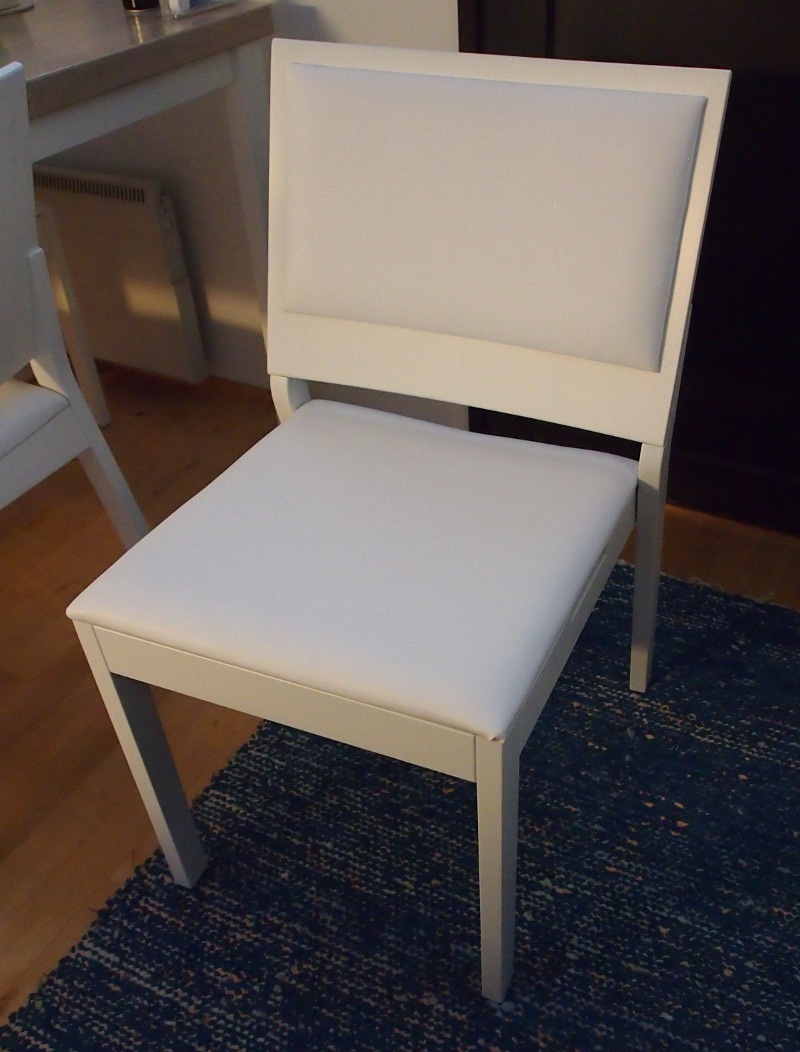 Oma projekti, jossa hyödynnettiin käytöstä poistettuja tuoleja. Alunperin tuolit olivat sinertäväksi petsatua koivua, joten maalaaminen oli ainut vaihtoehto. Tuolit kunnostettiin ja maalattiin valkoiseksi. Verhoiluna on tekonahka. Pöytä on valkolakattua tammea ja pöydän jalat on maalattua koivua.
