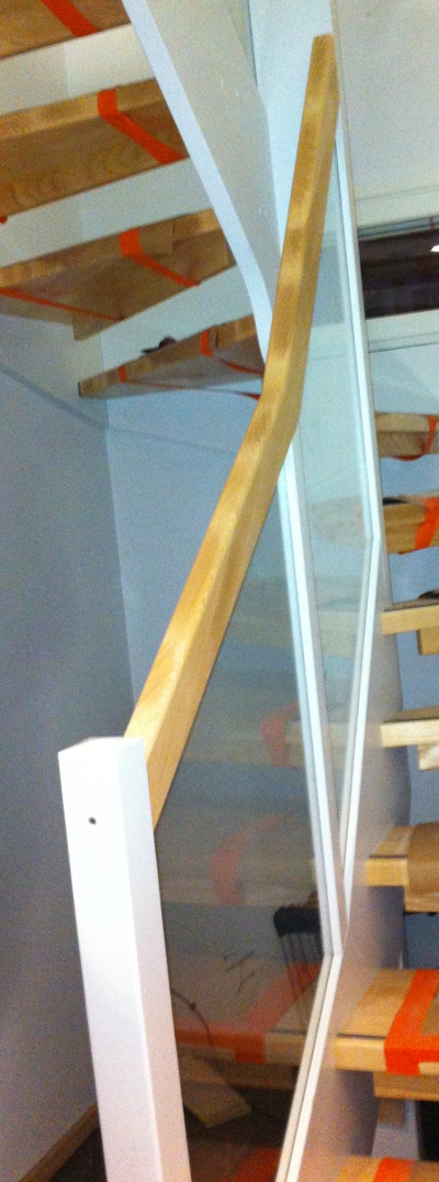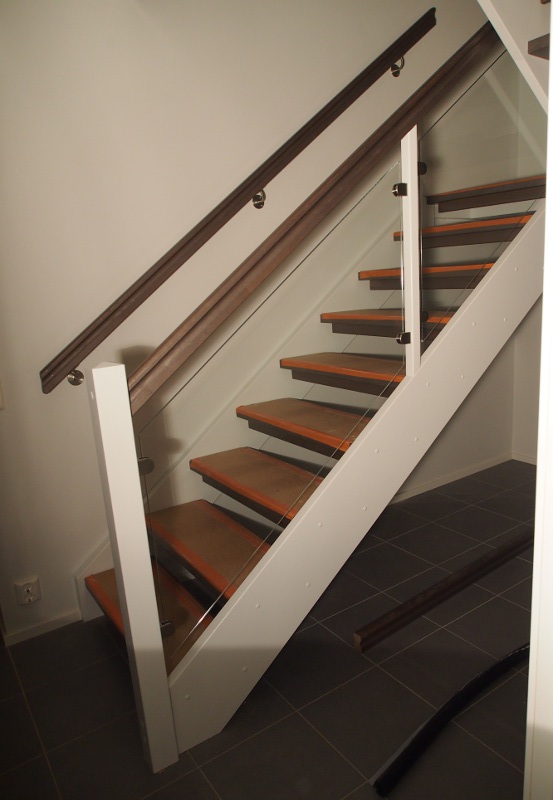 Mallistoomme kuuluu myös lasikaiteet, jotka saadaan sopimaan kaiken mallisten portaiden kanssa. Ulkonäöllisesti parhaaseen lopputulokseen päästään kun kaarteet eivät ole liian jyrkät. Jyrkästi nouseva käsijohde on lasin kanssa ongelmallinen. Leveään u-portaaseen lasit sopivat erittäin hyvin!